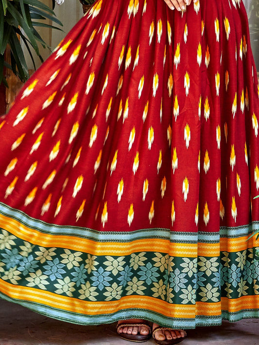Maroon Rayon Ikat Printed Flared Long Kurti