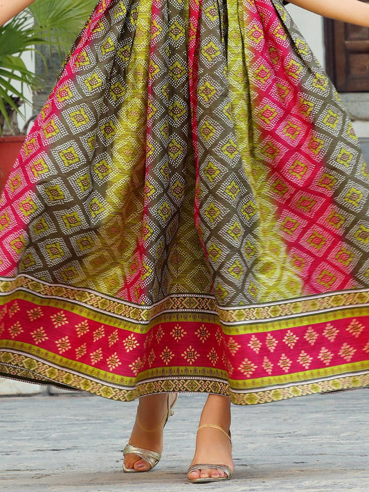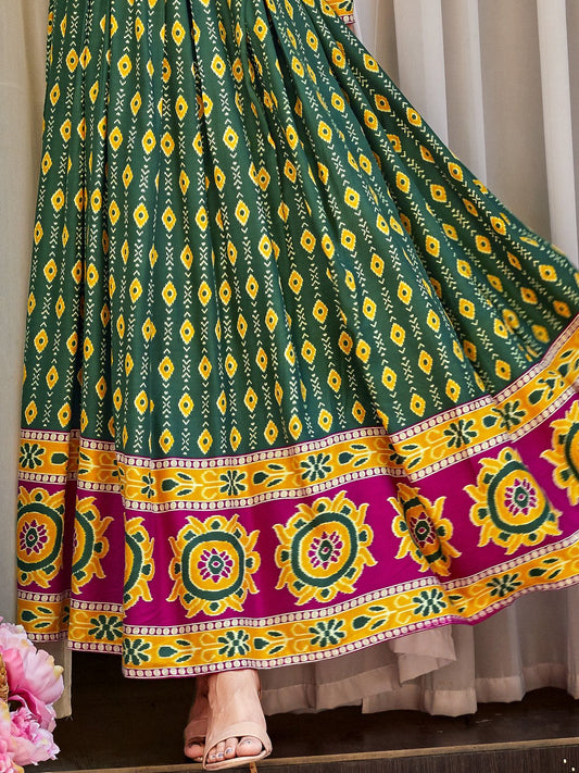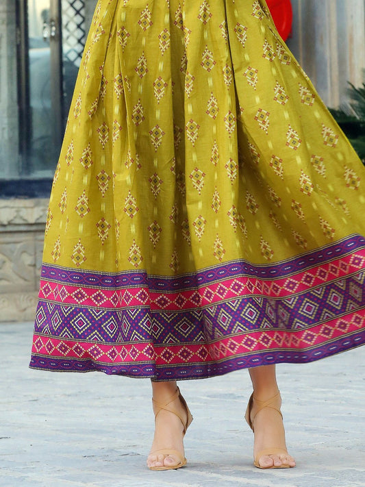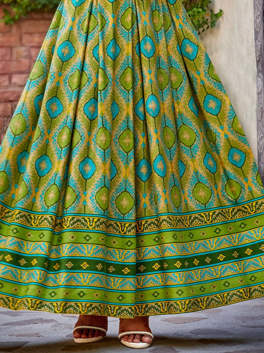 Mahendi green Ikat Printed Flared Designer Long Kurti