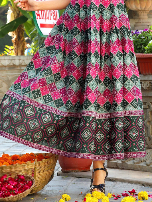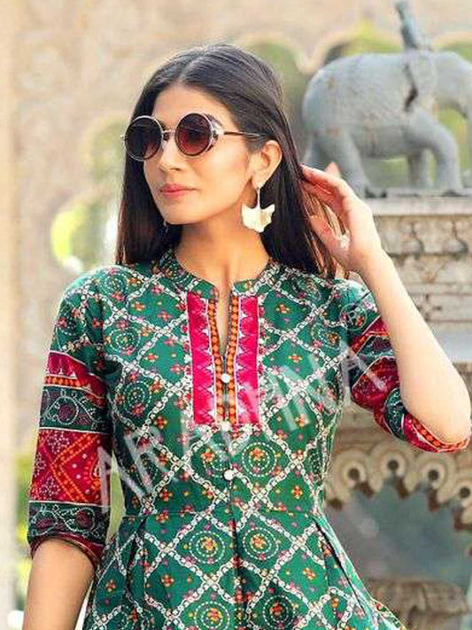 Green Printed Flared Cotton Long Kurti