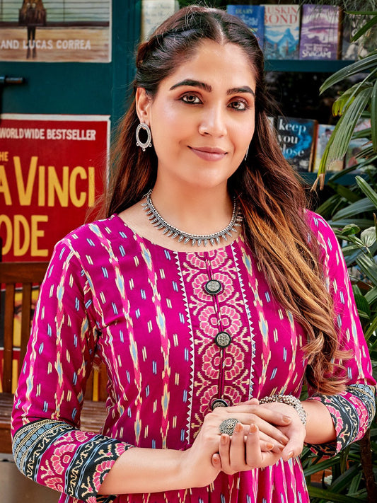 Hot Pink Rayon Ikat Printed Designer Long Kurti with Border