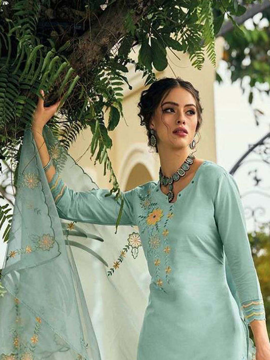 Yoke Embroidered Teal Muslin Jacquard Stitched Suit Set