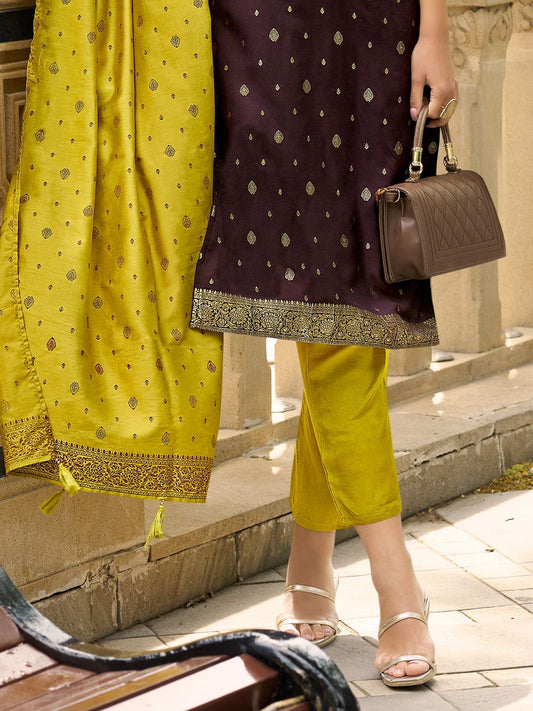 Yoke Embroidered Coffee Muslin Jacquard Stitched Suit Set
