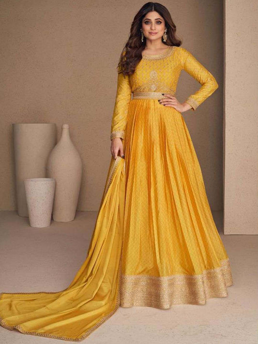 Embellished Yellow Chinon Silk Zari Stitched Gown with Dupatta