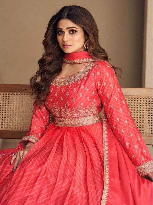 Embellished Coral Chinon Silk Zari Stitched Gown with Dupatta