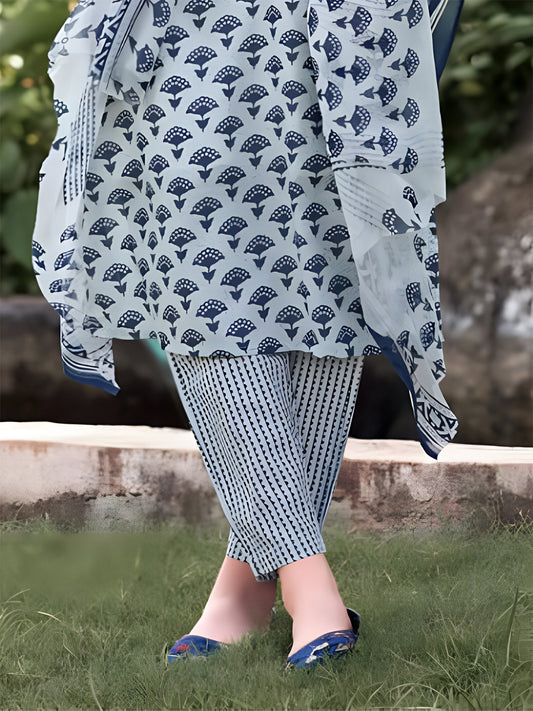 Blue Floral Pure Viscose Print Silk Stitched Suit Set