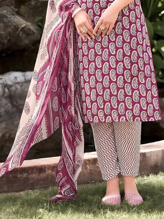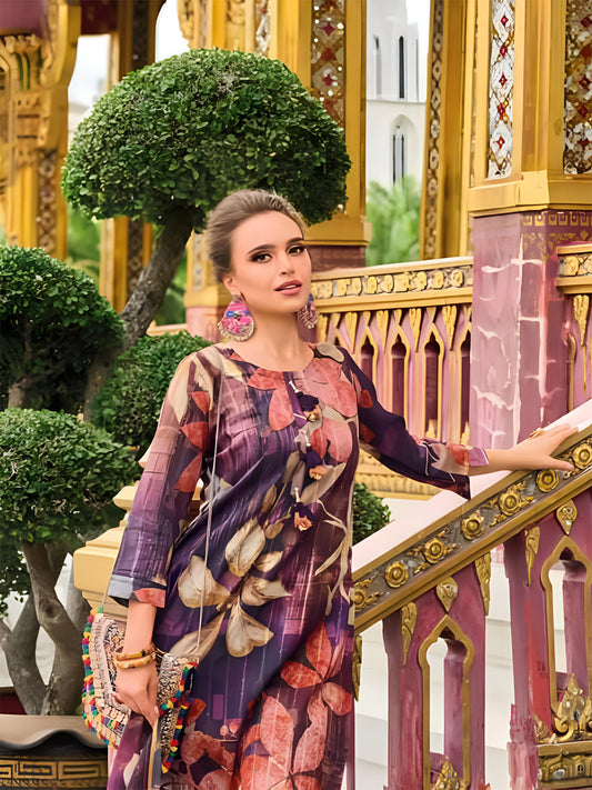 Purple Floral Pure Viscose Print Silk Stitched Suit Set