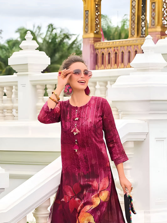Maroon Floral Pure Viscose Print Silk Stitched Suit Set