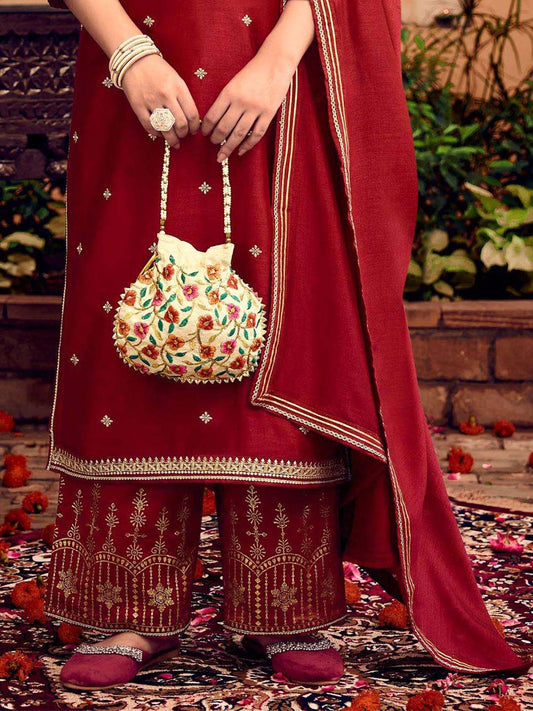 Jam Red Fancy Work Stitched Suit Set With Dupatta