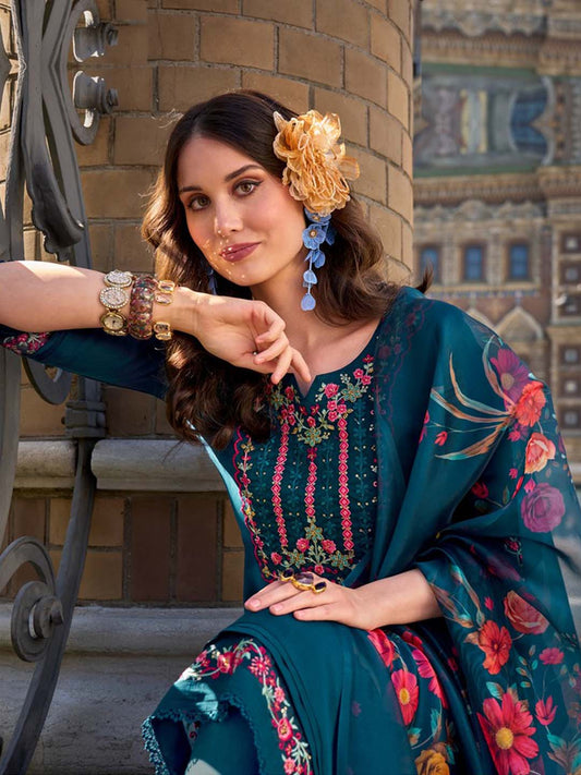 Teal Blue Fancy Work Stitched Suit Set With Dupatta
