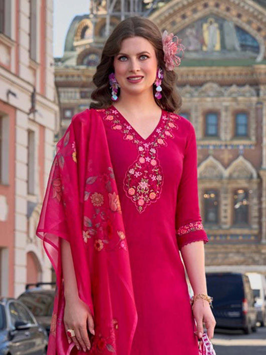Rose Red Yoke Embroidered Stitched Suit Set With Dupatta