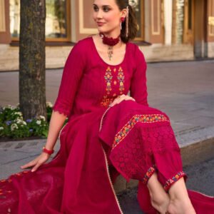 Cherry Red Exclusive Embroidered Stitched Suit Set With Dupatta