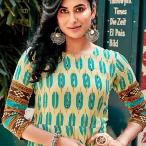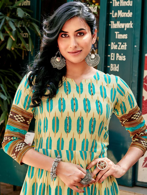 Be the first to review “Beige Ikat printed Rayon Flared Long Kurti with Border”