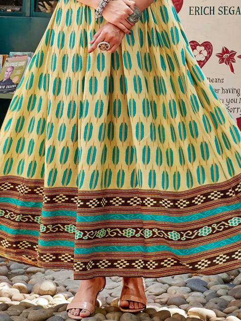 Beige Ikat printed Rayon Flared Long Kurti with Border