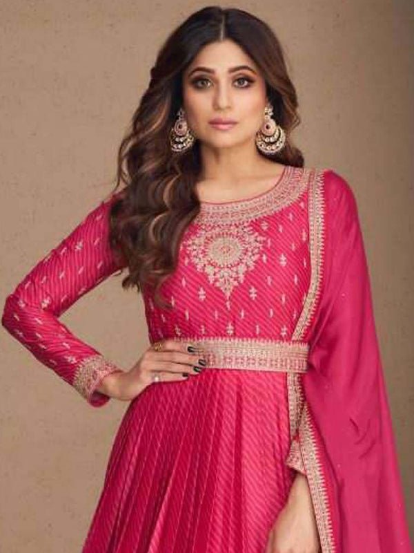 Work : Zari, Sequins & Stone Wash Care : Dry Clean only Type : Stitched Stye : Gown Sleeves : Full Sleeves Packet Content : 1N Gown, 1N Dupatta Neck : Round Neck Fit : Regular Fit Length : “Approx 58”Fabric Quality : Chinnon Silk Country of origin : IndiaColor : Dark Pink Category : Readymade GownBrand : Aashirwad Product Reference : Rani Sahiba-9592