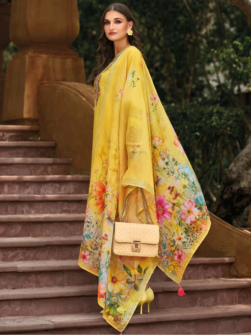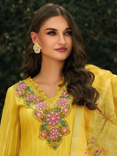 Floral Yoke Embroidered Stitched Suit Set With Dupatta