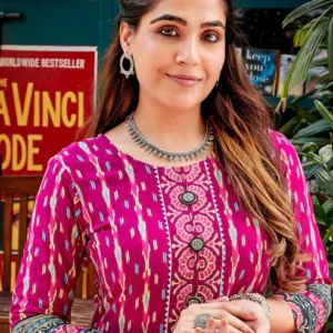 Be the first to review “Hot Pink Rayon Ikat Printed Designer Long Kurti with Border”